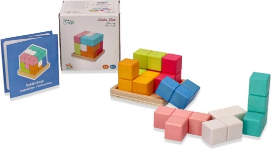 Puzzle kocka pomáha deťom rozvíjať jemnú motoriku a zvyšuje ich schopnosť riešiť problémy. S jasnými farbami ako modrá, oranžová, ružová a prírodné drevo, táto hračka nielen baví, ale aj vzdeláva.