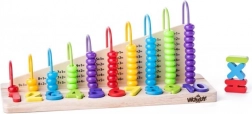 Súprava obsahuje drevené počítadlo a 13 vyberateľných farebných blokov v tvare čísel a symbolov +, - a =.
