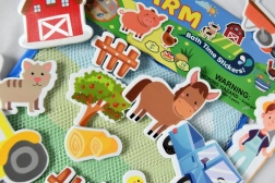 Doprajte deťom kúpeľ plný fantázie. Sada penových samolepiek s motívom farmy prináša 18 dielikov – roztomilé zvieratká, traktor, stodolu a ďalšie prvky, ktoré deti ľubovoľne kombinujú a vytvárajú vlastné príbehy. Stačí kvapka vody a samolepky pevne držia na hladkých povrchoch, zároveň sa však dajú ľahko sňať a znovu použiť.