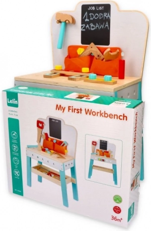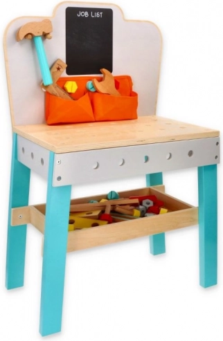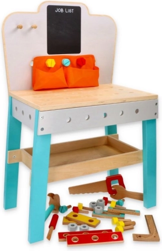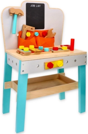 Detský drevený pracovný stôl s tabuľou je ideálnym darčekom pre malých domácich majstrov. Stôl obsahuje vhodne upravené drevené nástroje, ako sú kladivko, pílka, a kľúč, ktoré deťom umožňujú simulovať rôzne konštruktérske a opravárske činnosti. S tabuľou JOB LIST môžu deti plánovať svoje projekty a učiť sa organizácii práce. Praktické vrecká na nástroje a police poskytujú dostatok úložného priestoru.