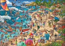 Poskladané puzzle má rozmery približne 70 x 50 cm a je ideálne pre spoločné rodinné chvíle alebo relaxáciu o samote. Ponorte sa do živej atmosféry pláže, kde si ľudia užívajú surfovanie, plávanie a oddych počas slnečného dňa.