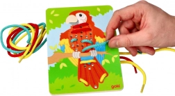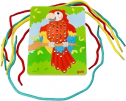 Úžasná drevená prevliekacia hračka v podobe farebného papagája s viacfarebnými šnúrkami pre zábavnú hru.