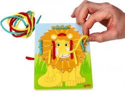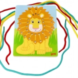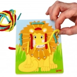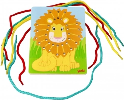Lev v žiarivých farbách s otvormi pre ľahké prevliekanie šnúrok, ktorý prispieva k rozvoju jemnej motoriky.