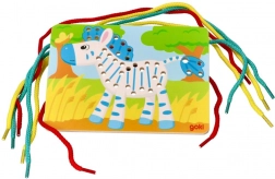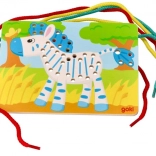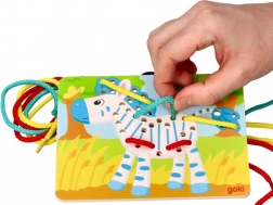 Farebná drevená zebra s otvormi pre šnúrky, ideálna pre nácvik koordinácie rúk a očí.
