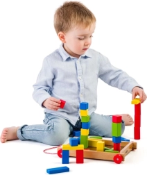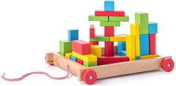 Drevený vozík s kockami je nadčasová hračka, ktorá spája pohyb a tvorenie. Deti môžu vozík ťahať po izbe a skladať z kociek veže, domčeky aj jednoduché stavby. Živé farby prirodzene lákajú k hraniu a precvičujú rozpoznávanie tvarov a farieb.