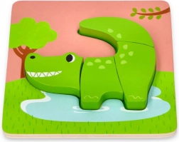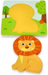 Deti si postupne poskladajú krokodíla, hrocha, sovu aj leva – každý motív na samostatnej drevenej doske podporuje sústredenie a radosť z úspechu.