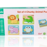 Tento set 4 drevených puzzle prináša deťom od 12 mesiacov bezpečnú a zábavnú cestu k učeniu. Farebné motívy zvieratiek a masívne dieliky uľahčujú uchopenie, skladanie aj prvé rozpoznávanie tvarov a farieb. Každé puzzle má svoj vlastný motív a scénu, ktorá podporuje predstavivosť a sústredenie.