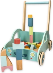 Gumové pásiky na kolieskach zabezpečujú lepšiu priľnavosť k podlahe a tichší chod. Vozík má dostatok miesta na ukladanie farebných drevených kociek, takže sa učenie chôdze prirodzene prepojí s voľnou hrou a stavaním. Zostavenie je jednoduché – po vybratí z krabice iba pripevníte dve zvislé dosky a horné madlo (skrutky sú v balení, skrutkovač nie je súčasťou).