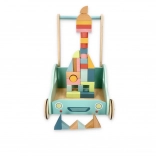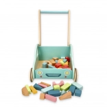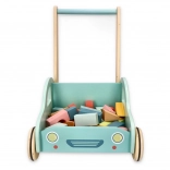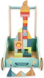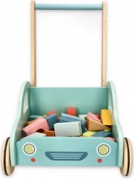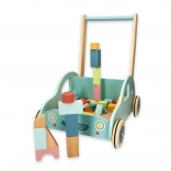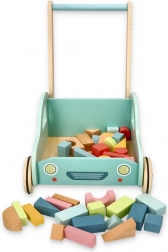 Farebné drevené kocky rozvíjajú jemnú motoriku, predstavivosť aj logické myslenie. Vozík slúži ako praktický úložný priestor pre kocky aj hotové stavby.