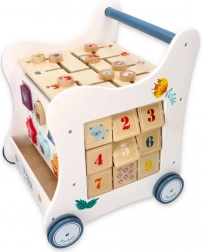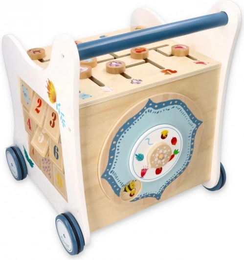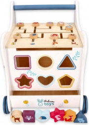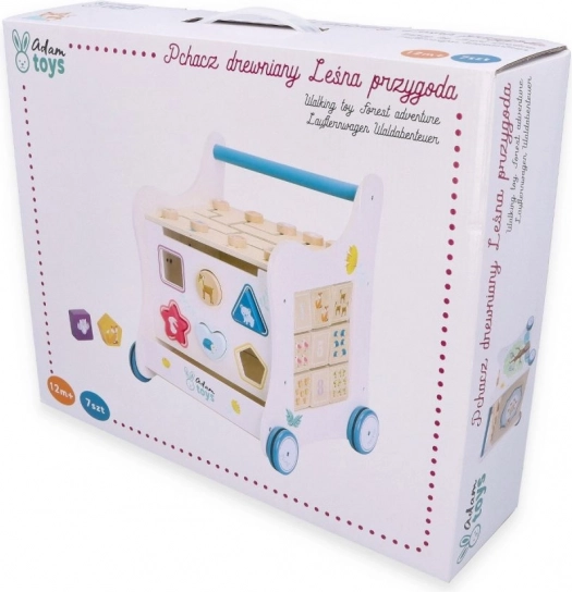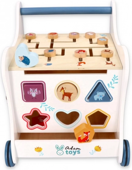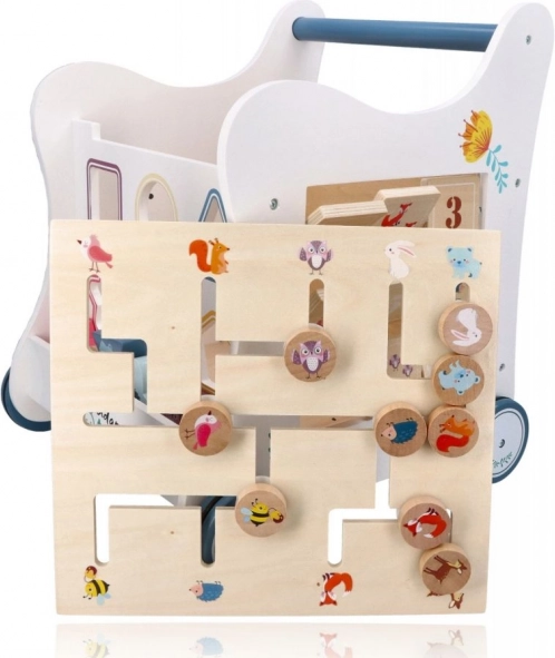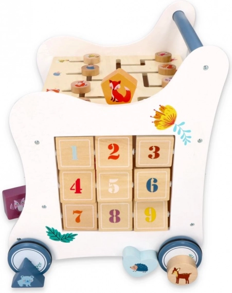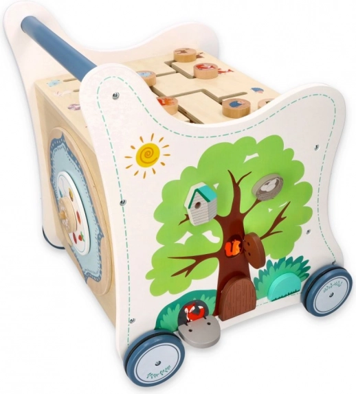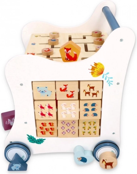 Toto drevené tlačacie chodítko prevedie vaše dieťa svetom farieb, tvarov a lesných zvierat. Predný panel ponúka zábavnú tvarovú vkladačku, ktorá rozvíja jemnú motoriku, koordináciu ruka–oko a logické myslenie. Na hornej strane čaká labyrint s posuvnými korálikmi, ktorý podporuje trpezlivosť, plánovanie a priestorovú predstavivosť. Bočné ilustrácie so zvieratkami inšpirujú k objavovaniu prírody aj k vymýšľaniu vlastných príbehov.