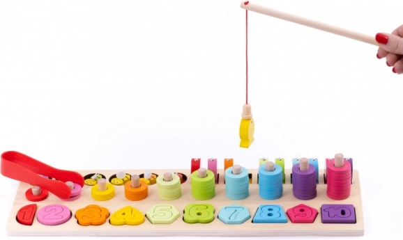 Táto multifunkčná drevená hračka je ideálna pre prvé kroky do sveta počítania a tvarov. Deti si hrou precvičia rozlišovanie farieb, priraďovanie čísel 1–10, navliekanie krúžkov a chytanie dielikov pomocou magnetického prúta. Súčasťou sú aj plastové pinzety na zvýšenie náročnosti a tréning úchopu.