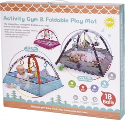 Podložka je pevná a odolná, navrhnutá tak, aby vydržala dlhodobé používanie. Zavesené hračky a pastelové loptičky prispievajú k rozvoju zmyslov.