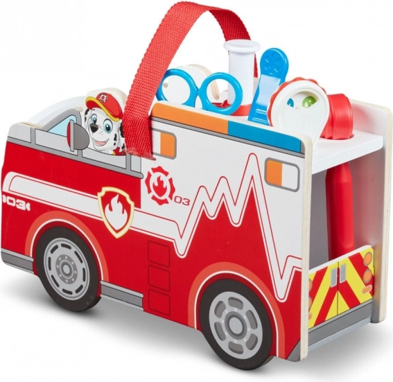 Podporuje rolové hranie, rozvoj jemnej motoriky aj sociálnych zručností. Deti si vyskúšajú prácu záchranárov a lekárov s doplnkami, ako je striekačka, nožnice, fľaštička či odznak. Praktické madlo umožní vziať si hru kedykoľvek so sebou.