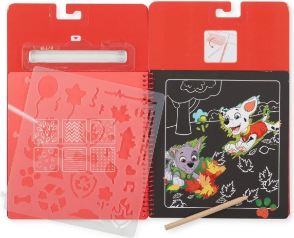 Špirálový škrabací blok s motívom PAW PATROL – Marshall kombinuje kúzlo odkrývacích obrázkov s praktickými šablónami. Stačí jemne škrabať dreveným stylusom a pod čiernou vrstvou sa objavia žiarivé farby a detailné ilustrácie obľúbených hrdinov. Skvelé pre prvé kreslenie, trpezlivosť a sústredenie.
