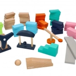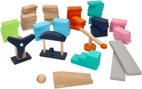 - 120 drevených kociek v 6 farbách, 3 mechanické prvky (napr. kolotoč, veterník, bránka s guľôčkou), 2 mostové dosky, 3-stupňové schodíky, štartovacia šmykľavka s guľôčkou
