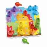Kreatívna stavebnica Jumbo Peggy umožňuje deťom používať farebné kolíky, základne a kolesá na tvorbu vlastných vozidiel. Komponenty sú navrhnuté špeciálne pre malé deti.