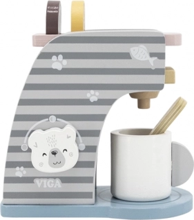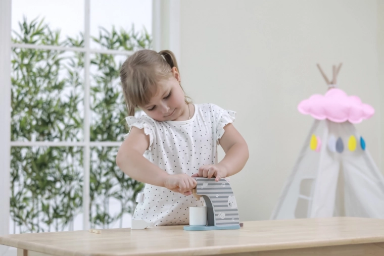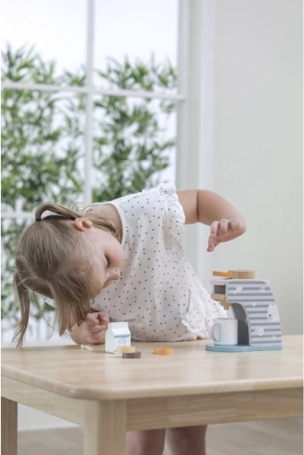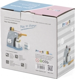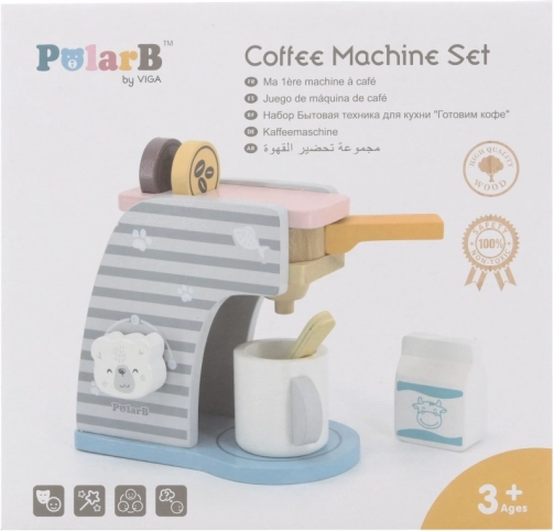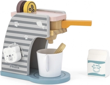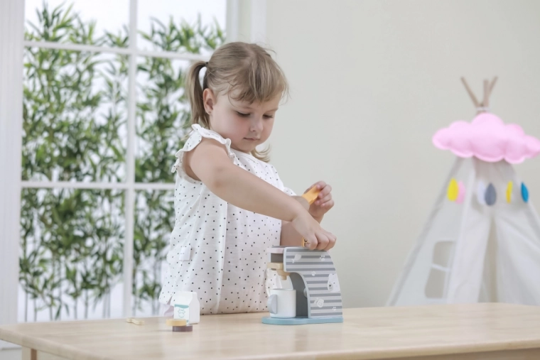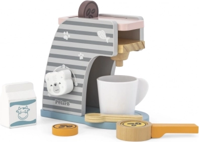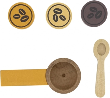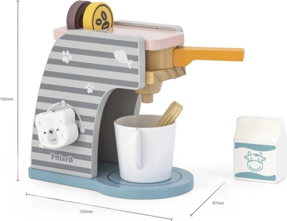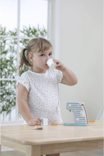 Tento drevený detský kávovar v jemných farbách s roztomilými motívmi je navrhnutý pre malých baristov. Otočné prvky a pákový systém napodobňujú skutočný kávovar, takže si deti môžu „urobiť“ espresso, pridať „mlieko“ a premiešať lyžičkou v bielej šálke.