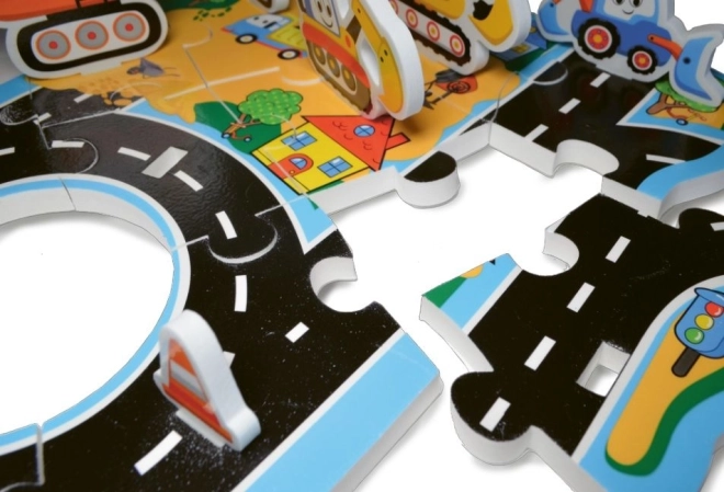 Ľahké penové dieliky plávajú a po navlhčení držia na obkladačkách. Deti si postavia cesty, rozmiestnia značky a oživia hru stavebnými vozidlami.