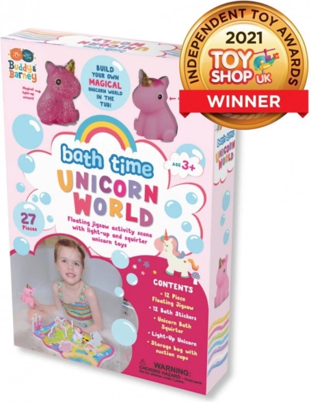 Kúpacia sada Jednorožcí svet prináša deťom pestrý svet plný jednorožcov, zámkov a čarovných ciest. Ľahké penové dieliky plávajú, skladajú sa ako puzzle a po navlhčení držia na hladkých plochách kúpeľne. Deti tak môžu rozprávať vlastné príbehy a rozvíjať fantáziu priamo vo vani.