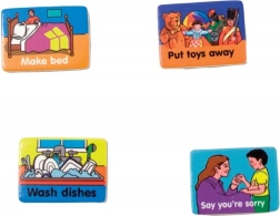 Štyri rôzne kartičky znázorňujú domáce úlohy, ako je ustieľanie postele alebo umývanie riadu, a pomáhajú deťom spomenúť si na ich povinnosti.