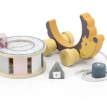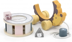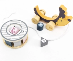 Hračka má kompaktné rozmery 20 × 16,5 × 10 cm a pohodlný povrázok s dĺžkou 53 cm, ktorý presne sadne do detskej ruky. Kvalitné drevené prevedenie a certifikácia CE zaručujú bezpečnú a odolnú hru každý deň.
