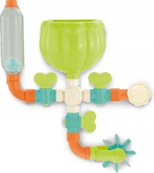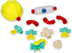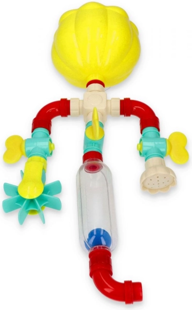 Veselý vodný systém s lievikom, trubkami a vodným kolieskom spestrí každé kúpanie. Dieťa nalieva vodu do lievika a pozoruje, ako sa rozbieha vodný tok rôznymi cestami. Táto interaktívna hračka rozvíja koordináciu ruka–oko a podporuje prirodzené objavovanie fyzikálnych javov.