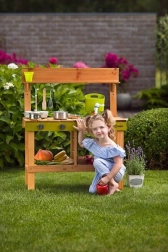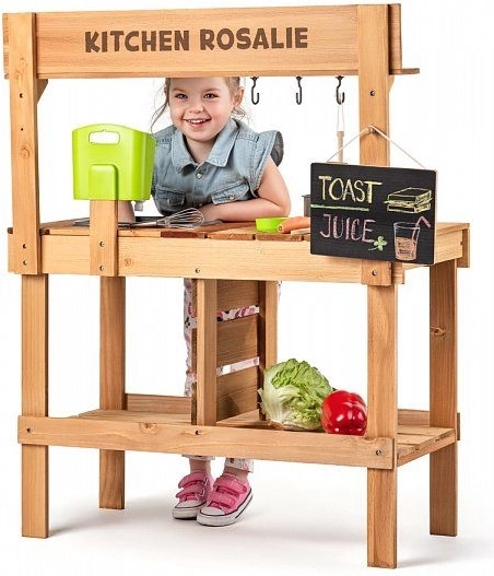 Drevená kuchynka Rosalie prináša deťom realistický priestor na hranie sa na varenie – od miešania a umývania v plastovom dreze až po servírovanie na pracovnej doske. Odolná kombinácia dreva a plastu je vhodná na vonkajšie použitie, zatiaľ čo háčiky a poličky udržia všetky riady a suroviny prehľadne po ruke.