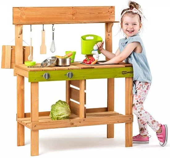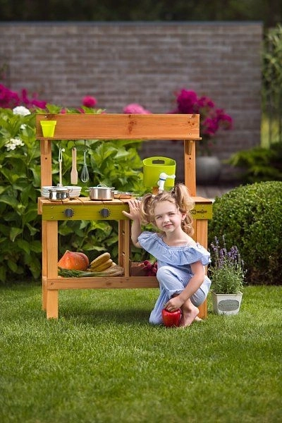Vďaka výrazným zeleným prvkom kuchynka krásne zapadne do záhrady a podporí zmyslovú hru s vodou, hlinou aj lístím. Je ideálna pre deti od 3 rokov a pomáha rozvíjať fantáziu, role-play a sociálne zručnosti.