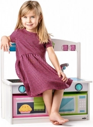 Táto multifunkčná drevená kuchynka a lavica 2v1 ponúka deťom hodiny zábavy a praktické využitie v jednom. Kuchynka je vybavená varičom s otočnými gombíkmi, drezom s kohútikom a úložnými priehradkami pripomínajúcimi rúru a mikrovlnku. Vďaka stabilnej konštrukcii je vhodná na každodenné hranie aj sedenie.