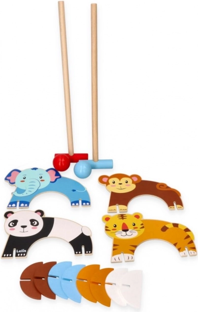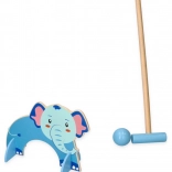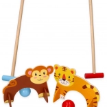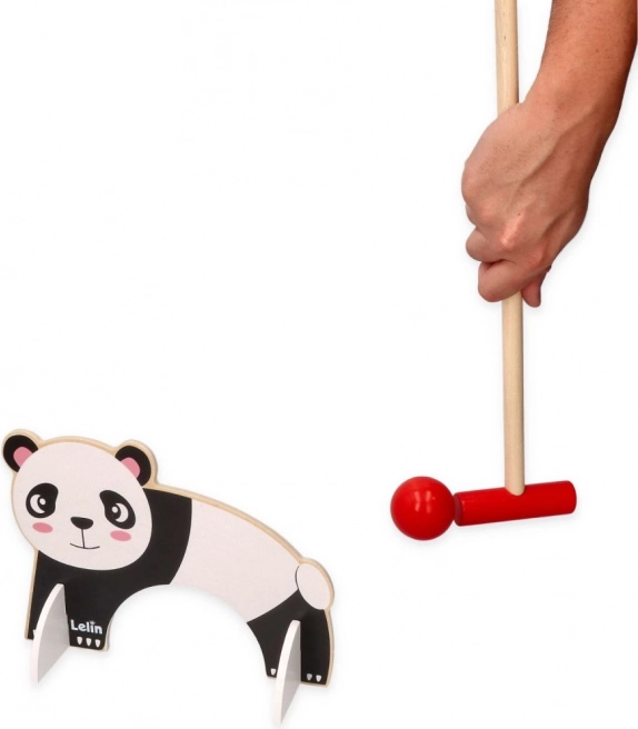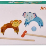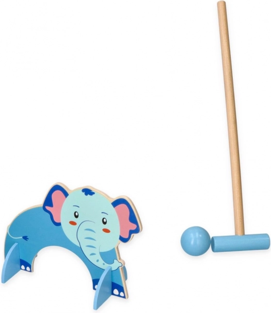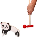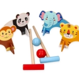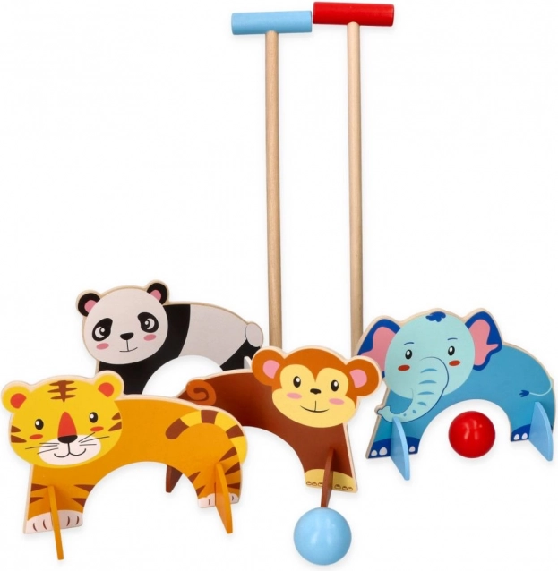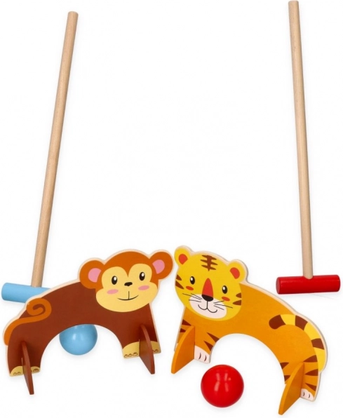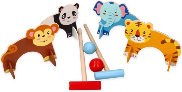 Tento drevený kroketový set je ideálny pre malé deti, ktoré si chcú užiť vonkajšiu zábavu. Hra zahŕňa farebné kladivká a gule, pričom každá bránka má svoj zvierací motív, čo vytvára interaktívny a imaginatívny herný zážitok.