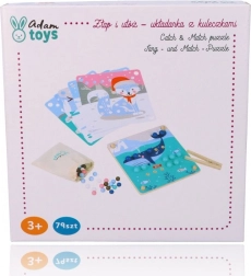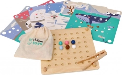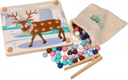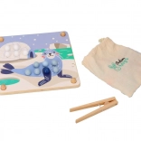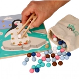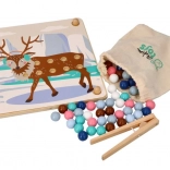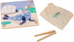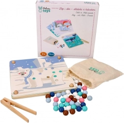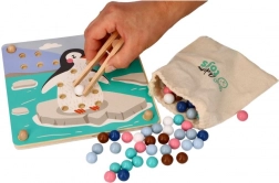 Táto zábavná vzdelávacia hra spája prirodzenú detskú zvedavosť s tréningom zručností: pomocou drevenej pinzety deti prenášajú guľôčky a ukladajú ich do otvorov podľa farieb a šablón s motívmi arktických zvierat (tučniak, tuleň, sob, ľadový medveď). Hra podporuje sústredenie, presný úchop a istotu ruky – ideálna pre predškolákov.