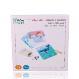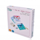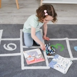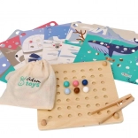 Masívna drevená doska, drevená pinzeta a textilné vrecúško s guľôčkami zaručujú bezpečné a dlhodobé používanie doma aj v škôlke.