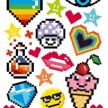 Farebné ikony srdiečok, hviezd, pút, lístkov či zmrzliny dodajú vášmu oblečeniu výrazný pixel‑art vzhľad.