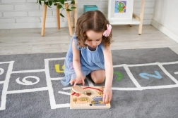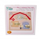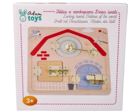 Táto zmyslová aktívna tabuľa ponúka deťom zábavu aj učenie v jednom. Otváracie dvierka, háčiky, západky a ďalšie funkčné prvky deti motivujú k objavovaniu, precvičovaniu prštekov a trpezlivosti. Každé otvorenie odhalí farebné ilustrácie postavičiek z rôznych kútov sveta, ktoré podporujú vnímanie rozmanitosti a rozprávanie príbehov.