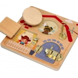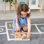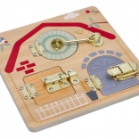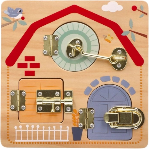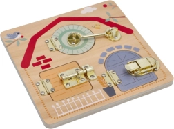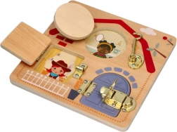 Tabuľa ponúka niekoľko typov uzáverov, ktoré deti postupne zvládajú. Každý mechanizmus prináša nové výzvy a trénuje prstovú obratnosť aj trpezlivosť.