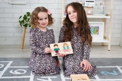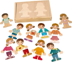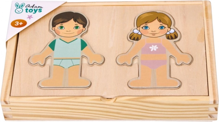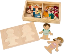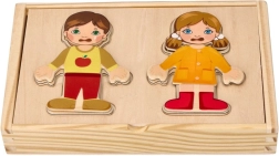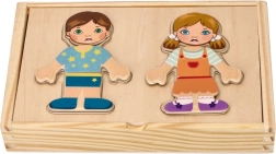 - Postavičky chlapca a dievčaťa s vymeniteľnými magnetickými dielikmi oblečenia, drevená krabička/podložka