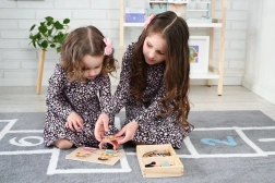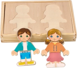 Táto drevená magnetická skladačka s postavičkami chlapca a dievčaťa ponúka desiatky možností, ako ich obliecť a kombinovať jednotlivé dieliky. Deti pri hre trénujú koordináciu oko–ruka, logické myslenie aj vnímanie tvarov a farieb.