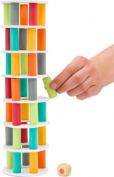 Kocka určuje farbu dielika, ktorý sa má vytiahnuť či pridať. Každý ťah preverí šikovnosť aj nervy – kto udrží vežu dlhšie v rovnováhe?