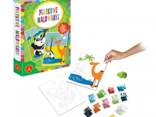 Sada Pieskové maľovanie Panda a ťava prináša deťom radosť z tvorenia pomocou farebného piesku. Vďaka samolepiacim obrázkom je proces jednoduchý a výsledky pôsobivé – stačí zlúpnuť vyznačené časti a posypať ich príslušnou farbou piesku.