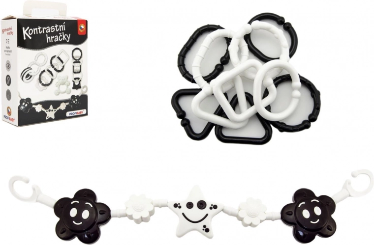 Táto kontrastná sada v čiernobielom prevedení je navrhnutá pre najmenšie bábätká, ktoré ešte nerozlišujú farby. Vysoko kontrastné vzory prirodzene priťahujú pozornosť a podporujú zrakovú stimuláciu aj sústredenie. Vďaka premysleným tvarom sú hračky ľahko uchopiteľné malou rúčkou a pomáhajú trénovať úchopový reflex aj koordináciu oko–ruka.