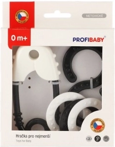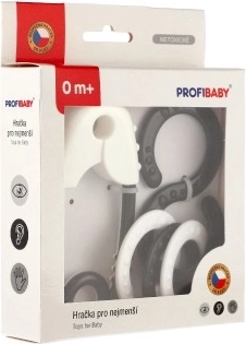 Súprava čiernobielych chrastítok, ideálna na stimuláciu zraku a sluchu malých detí. Perfektná veľkosť pre detské ruky.