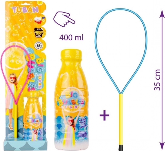 Zábavná sada na von: obruč na mydlové bubliny s kvalitnou tekutinou TUBAN s objemom 400 ml. Vytvárajte veľké bubliny a bublinové tunely, rozvíjajte jemnú motoriku a dych a užite si bezpečnú zábavu pre deti od 3 rokov. Ideálne na vonkajšie hry aj logopedické cvičenia.
