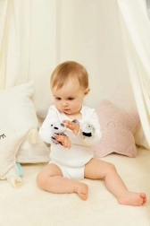 - Rozvoj zmyslov: stimuluje zrak kontrastom a sluch jemným hrkaním.