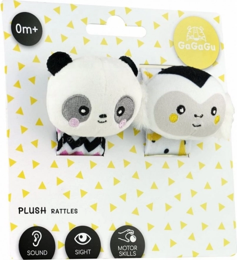 Plyšová hrkálka na ruku GAGAGU s opicou a pandou. Bez plastov, mäkká, kontrastná a bezpečná pre bábätká. Podporuje zrak, sluch aj jemnú motoriku.