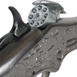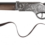Táto štýlová páková puška kombinuje kovové telo s „drevenou“ pažbou a nesie bohaté dekoratívne rytiny. Vďaka pevnej kovovej konštrukcii je ideálna na časté hranie a skvele sa hodí k detským westernovým dobrodružstvám. Oranžová koncovka hlavne jasne signalizuje, že ide o hračku.