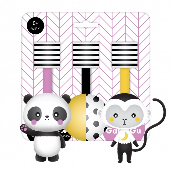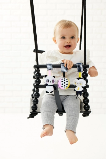 Závesné zvieratká môžu deti pozorovať ležiace na chrbte alebo preskúmať priamo v rukách. Plyšové kontrastné hračky sú odnímateľné, a preto ich možno samostatne pripevniť ku kočíku alebo k iným výrobkom z tejto kolekcie.