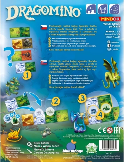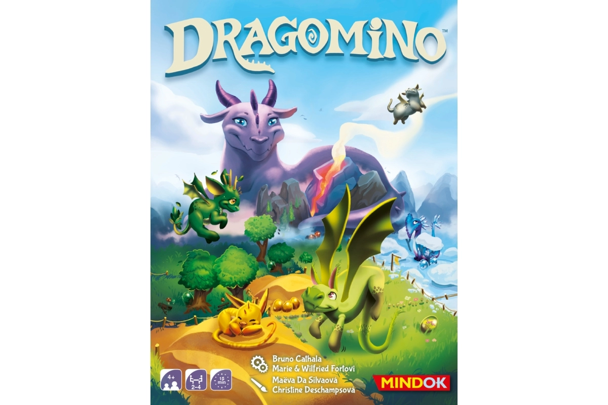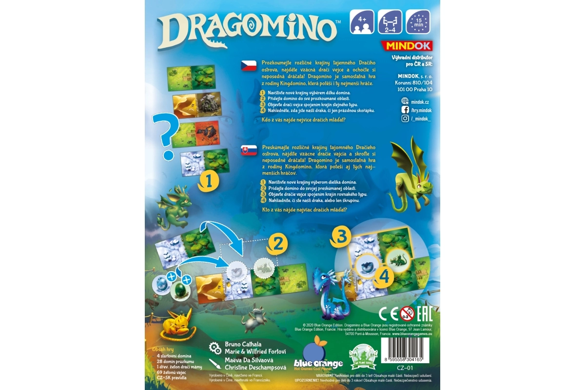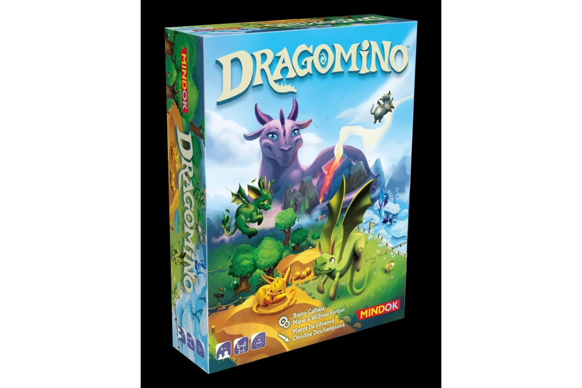 Preskúmajte rozličné krajiny tajomného Dračieho ostrova, nájdite vzácne dračie vajcia a skroťte neposedné dračatá! Dragomino je samostatná hra z rodiny Kingdomino, ktorá poteší aj tých najmenších hráčov. 1. Navštívte nové krajiny výberom dielika domina. 2. Pridajte domino do svojej preskúmanej oblasti. 3. Objavte dračie vajcia spojením krajín rovnakého typu. 4. Nazrite, či ste našli draka, alebo len prázdnu škrupinu. Kto z vás nájde najviac dračích mláďat? Vek 4+