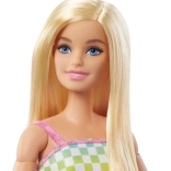 Bábika je oblečená v farebnom kockovanom outfite s doplnkami, čo posilňuje jej štýl a osobnosť.