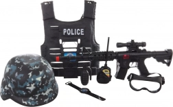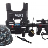 Prilba, okuliare, vysielačka, granát a hodinky vytvoria plnohodnotnú policajnú sadu. Vďaka sieťovanému baleniu máte všetko prehľadne pokope.