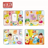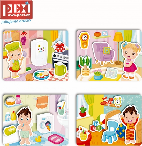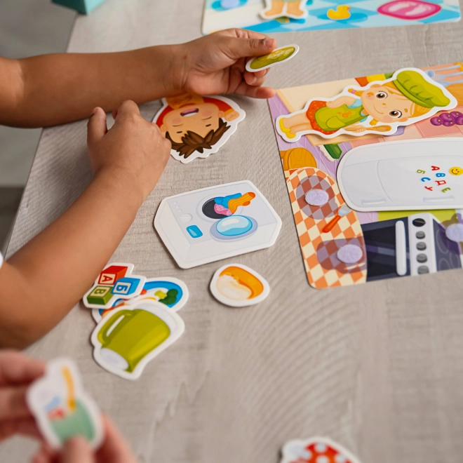 Velcro skladačky Domov zábavnou formou zoznamujú deti s predmetmi každodenného života a ich správnym umiestnením v domácnosti. Vďaka pružným plastovým doštičkám a dielikom so suchým zipsom je manipulácia jednoduchá a bezpečná. Špeciálna povrchová úprava je príjemná na dotyk a podporuje samostatnú hru.